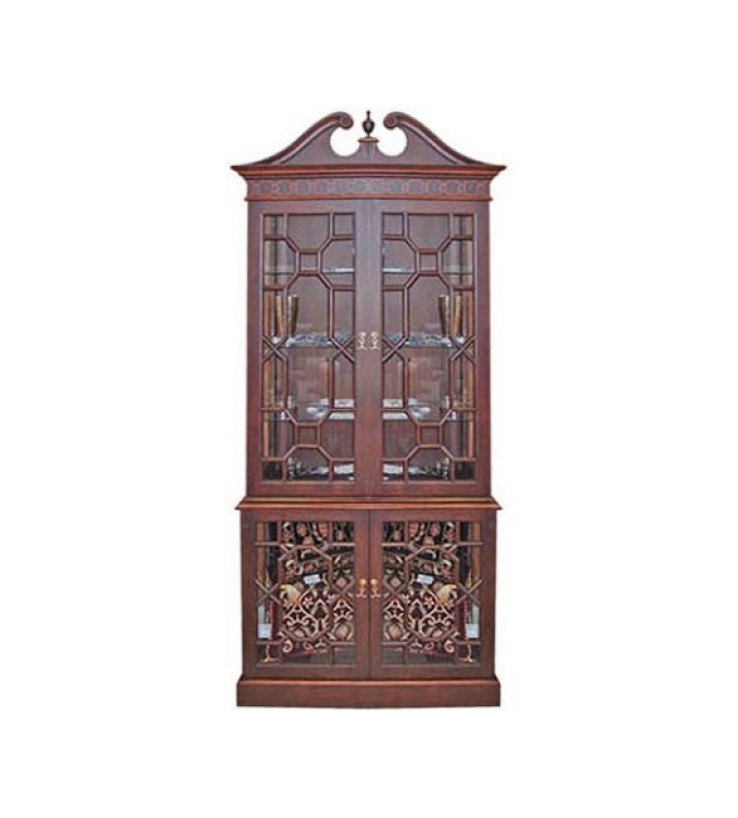 A traditional Roman display cabinet made from solid Rosewood with intricately carved cabinet doors as well as decorative wooden inlays and brass fittings.