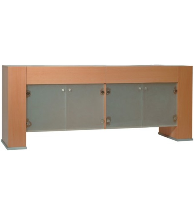 An angular, modern sideboard with frosted glass doors hung beneath a row of generously deep drawers.