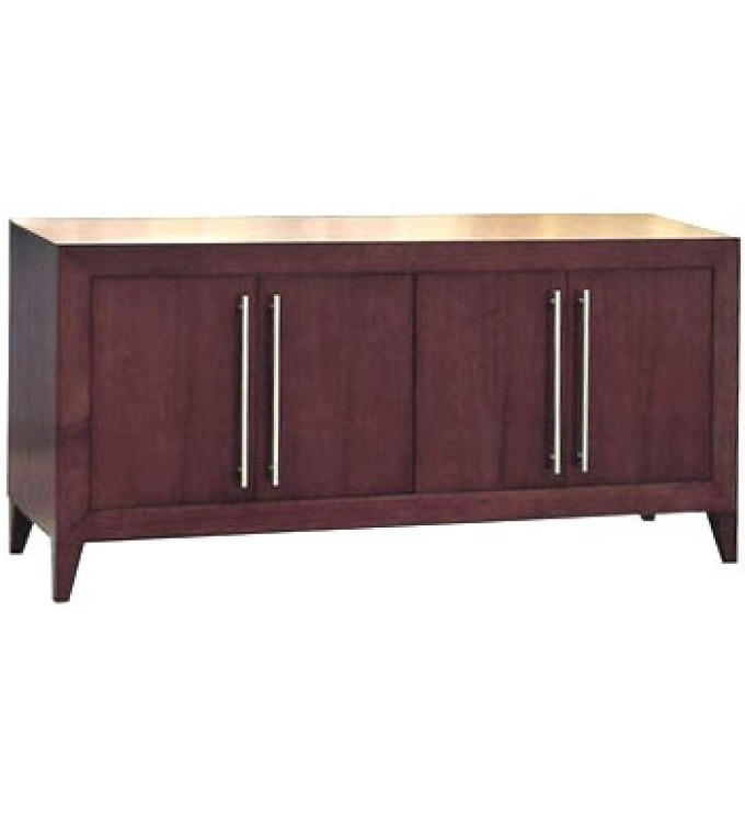A simplistic mahogany sideboard on low legs with a thick frame encompassing four doors with stainless steel strip handles.