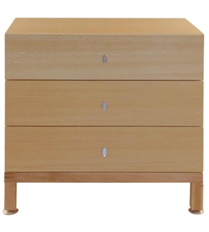 A simplistic wooden chest of drawers with three deep drawers and small silver handles