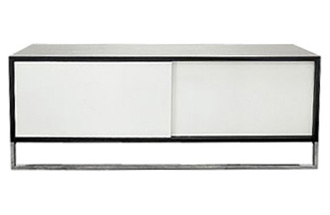 A modern wooden sideboard with two sliding doors resting on a square chromed base...