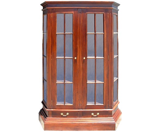 A traditional hexagonal display cabinet made from solid Rosewood with decorative wooden inlays, carv..