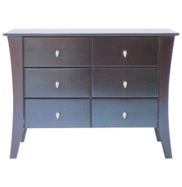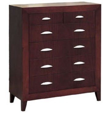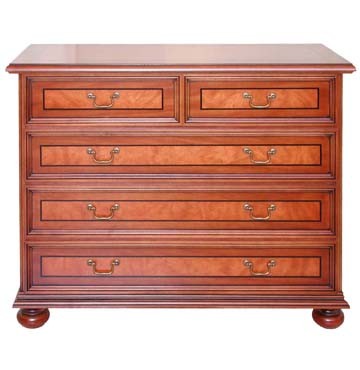 A simplistic mahogany six drawer chest featuring flush mounted drawers in a chunky framework...