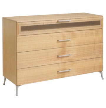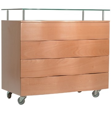 A contemporary chest of four curved drawers in beech wood on castors with a glass shelf suspended on..