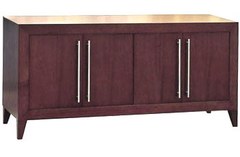 A simplistic mahogany sideboard on low legs with a thick frame encompassing four doors with stainles..