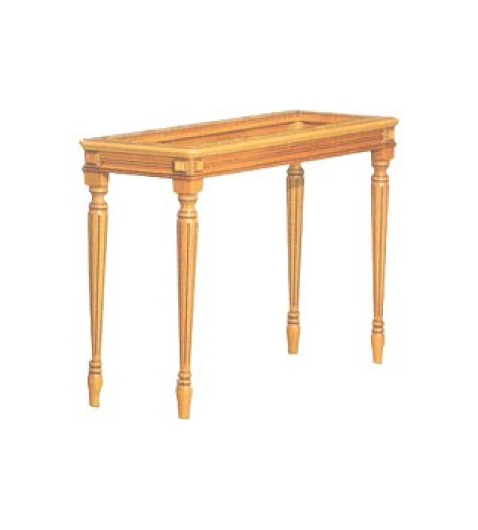 A contemporary sofa table / server with classical touches in natural or lime washed beech wood or color matched stain, neatly rounded edges, a glass inlay top and fluted legs.