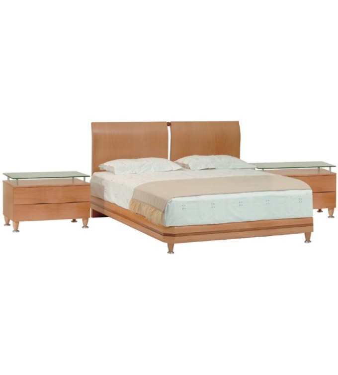 A modern bedroom suite with clean, simple lines featuring a curved headboard and long pedestals with curved frontages and a floating 10mm shaped glass top.