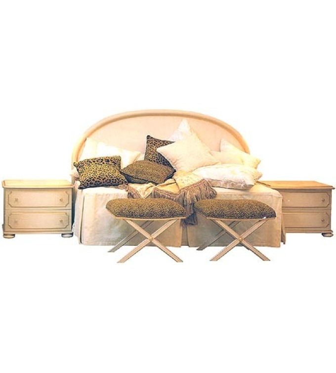 A contemporary bedroom suite with a curved headboard, two pedestals and optional scissor stools. Can be stained to various wood finishes or decorated in a variety of paint techniques, both with optional gilding.