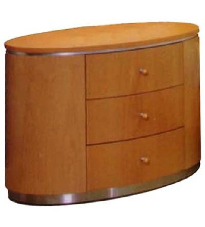 An oval pedestal with three drawers and stainless steel trim.