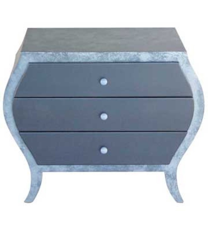 A modern bedside pedestal featuring three drawers encased in a chunky bow-shaped zinc shell.