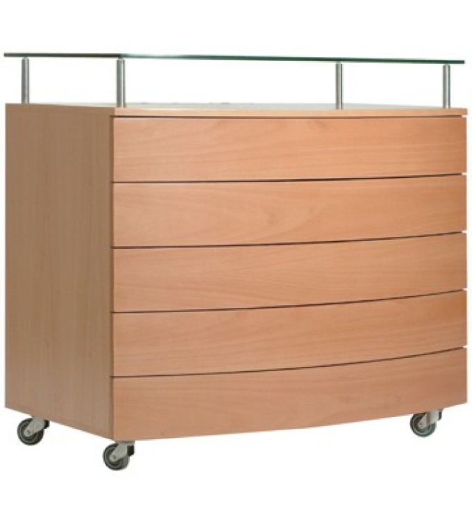 A contemporary chest of five drawers in beech wood on castors with a glass shelf suspended on four chrome uprights.