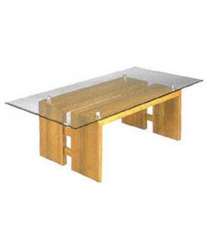 A modern coffee table with a floating glass top on stainless steel pins. Shown in solid cherry wood but also available in maple, teak or oak and in a range of sizes.