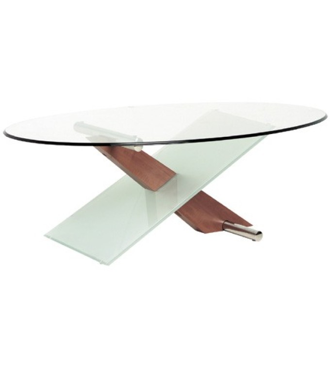 A modern coffee table with an oval glass top resting on a wood and glass X-frame.