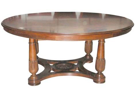 A mahogany dining room table with an ornate apron and a turned fluted leg with a inverted cup...