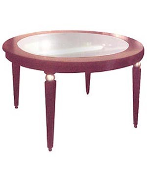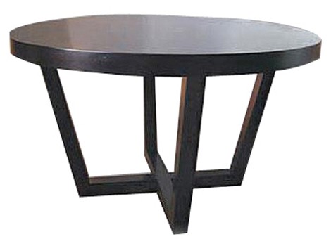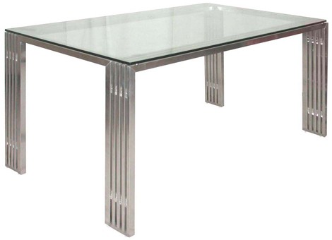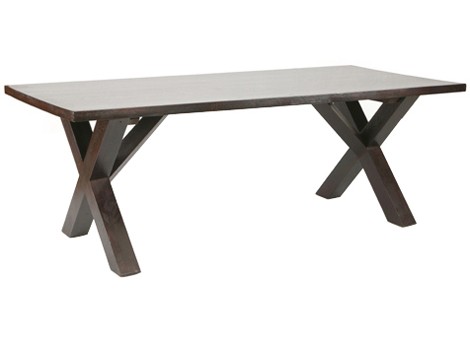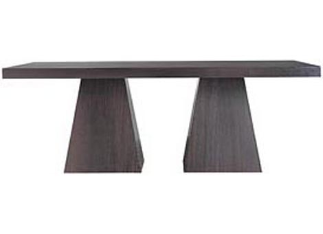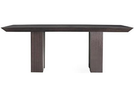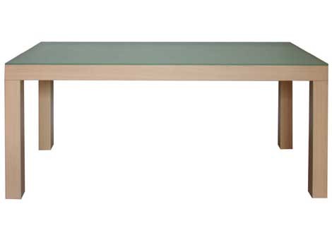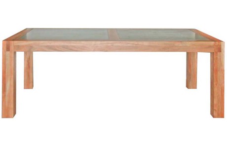A chunky dining room table with a framed top and a glass inlay on thick angled legs. Available in a ..