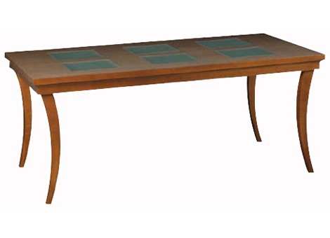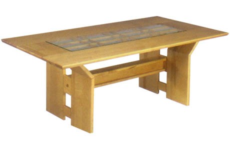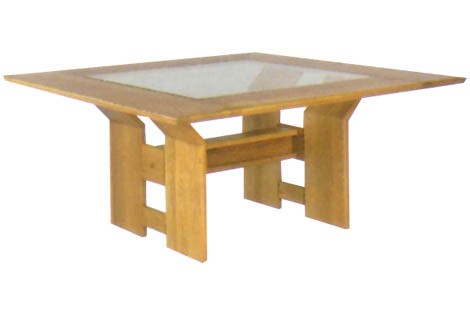 A chunky dining room table with a framed top and a glass covered lattice inlay on thick angled legs...
