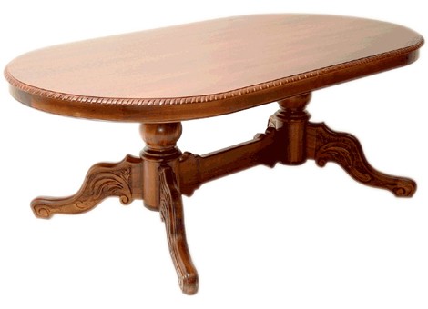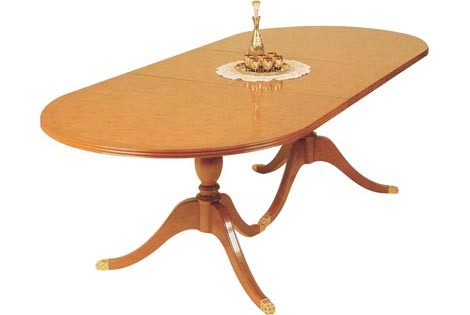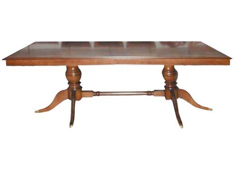 A period style extension dining room table on twin pedestal bases. Shown in Brazilian walnut...