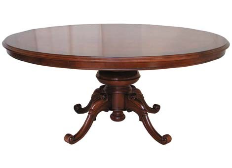 A period style dining room table with a circular top on a carved centre pedestal base...