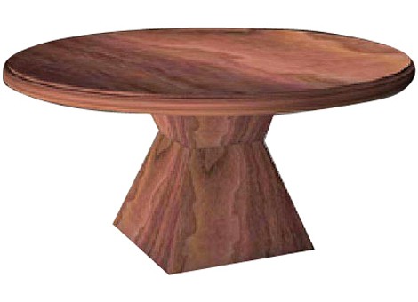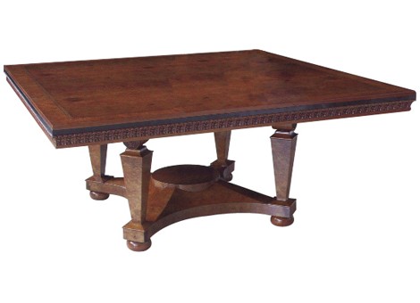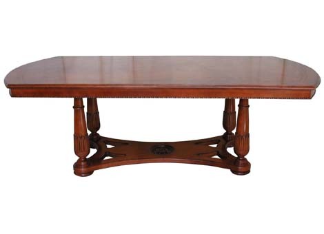 A period style dining room table with a four footed carved pedestal base. Shown in Brazilian walnut..