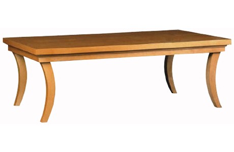 A contemporary dining room table with a broad apron and curved ends on a four poster carved base..