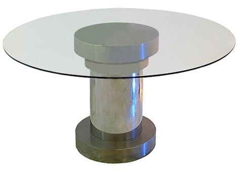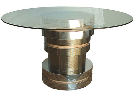 A circular dining room table featuring a glass centre inlay, with round balls breaking the clean lin..