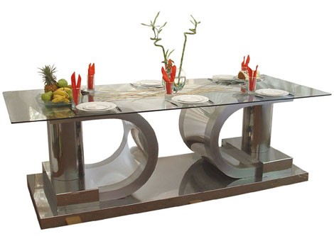 A modern 8 seater dining room table in mahogany, incorporating 6 side drawers with stainless steel s..