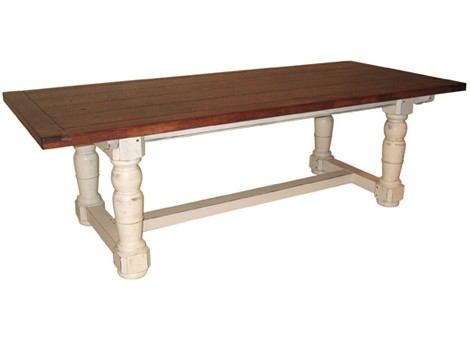A cottage style dining room table with a slatted top and a broad apron on chunky tapered legs.Availa..